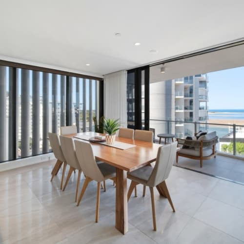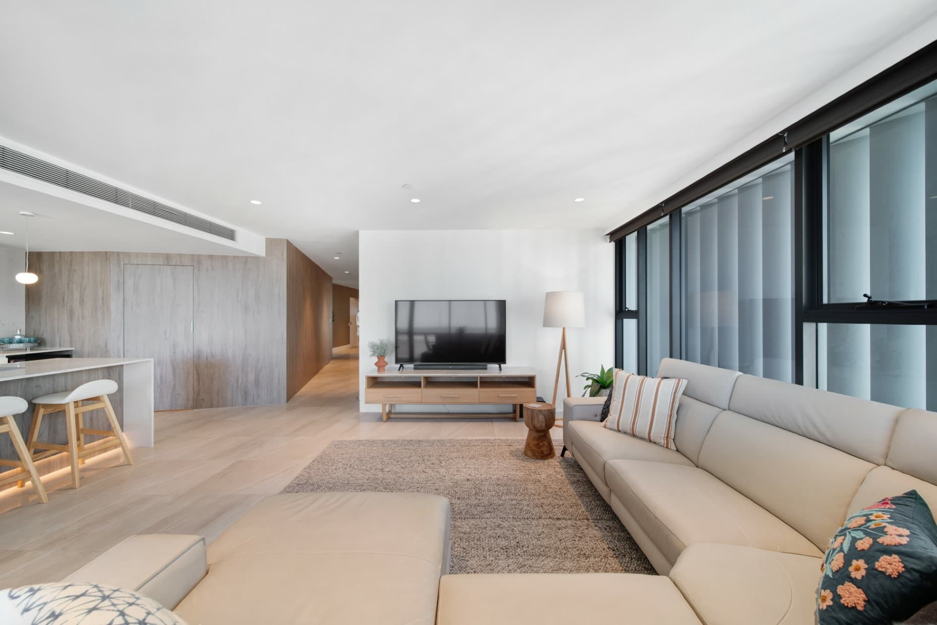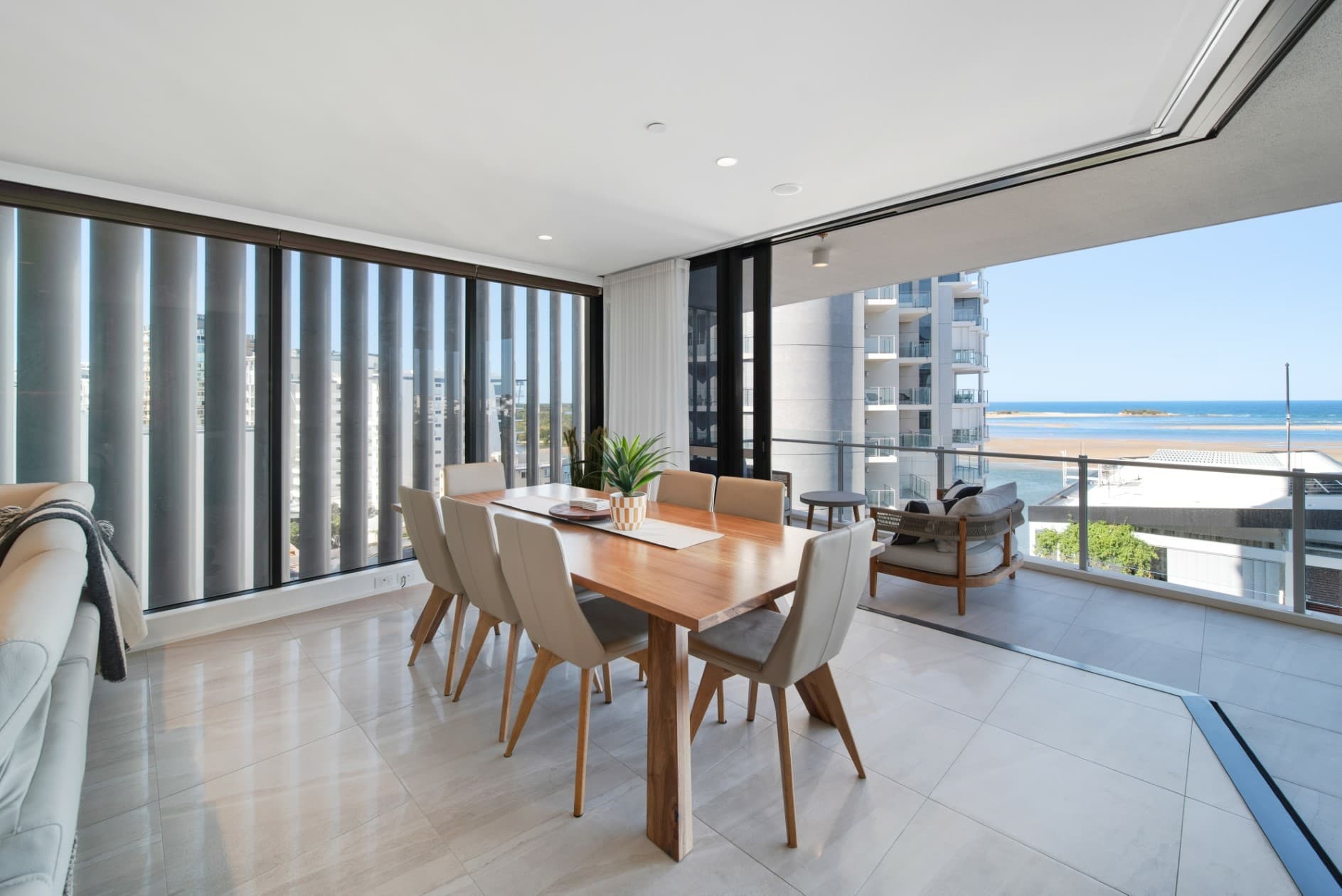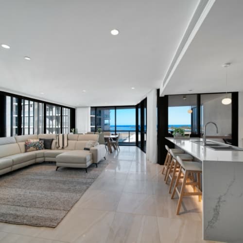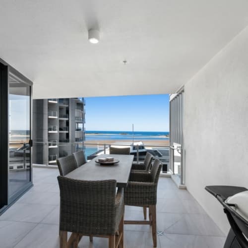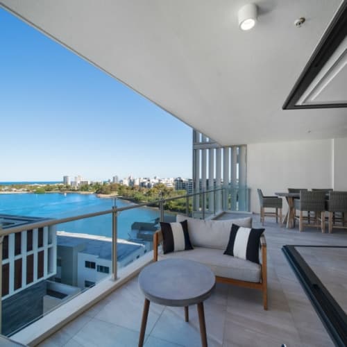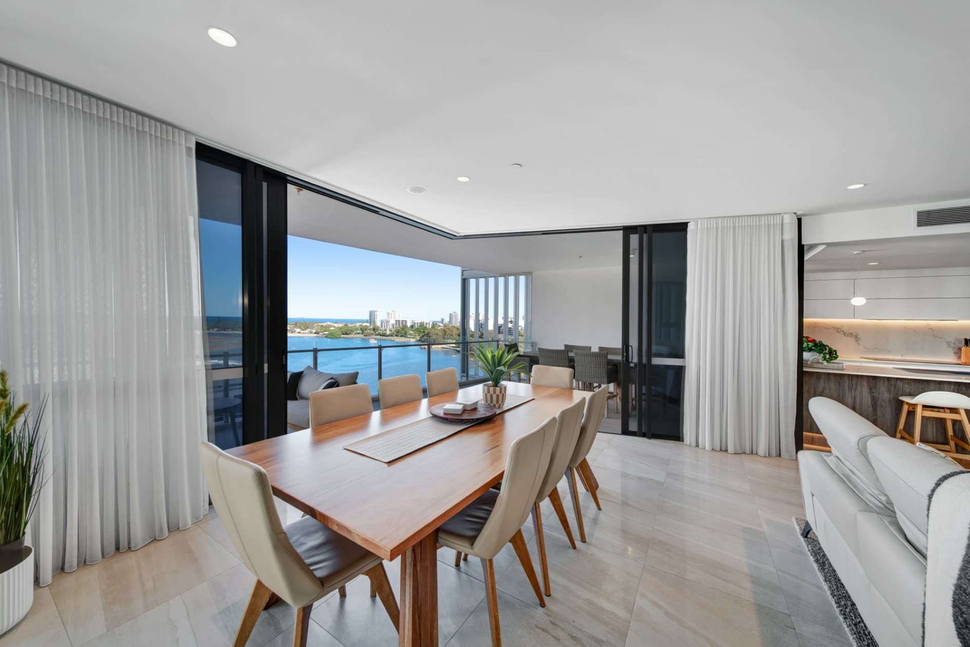 Alpha provides luxurious three-bedroom holiday apartments offering beautiful views over the Maroochy River and out to the ocean. Floor-to-ceiling windows flood the space with natural light, showcasing the sweeping water views from the living area.
