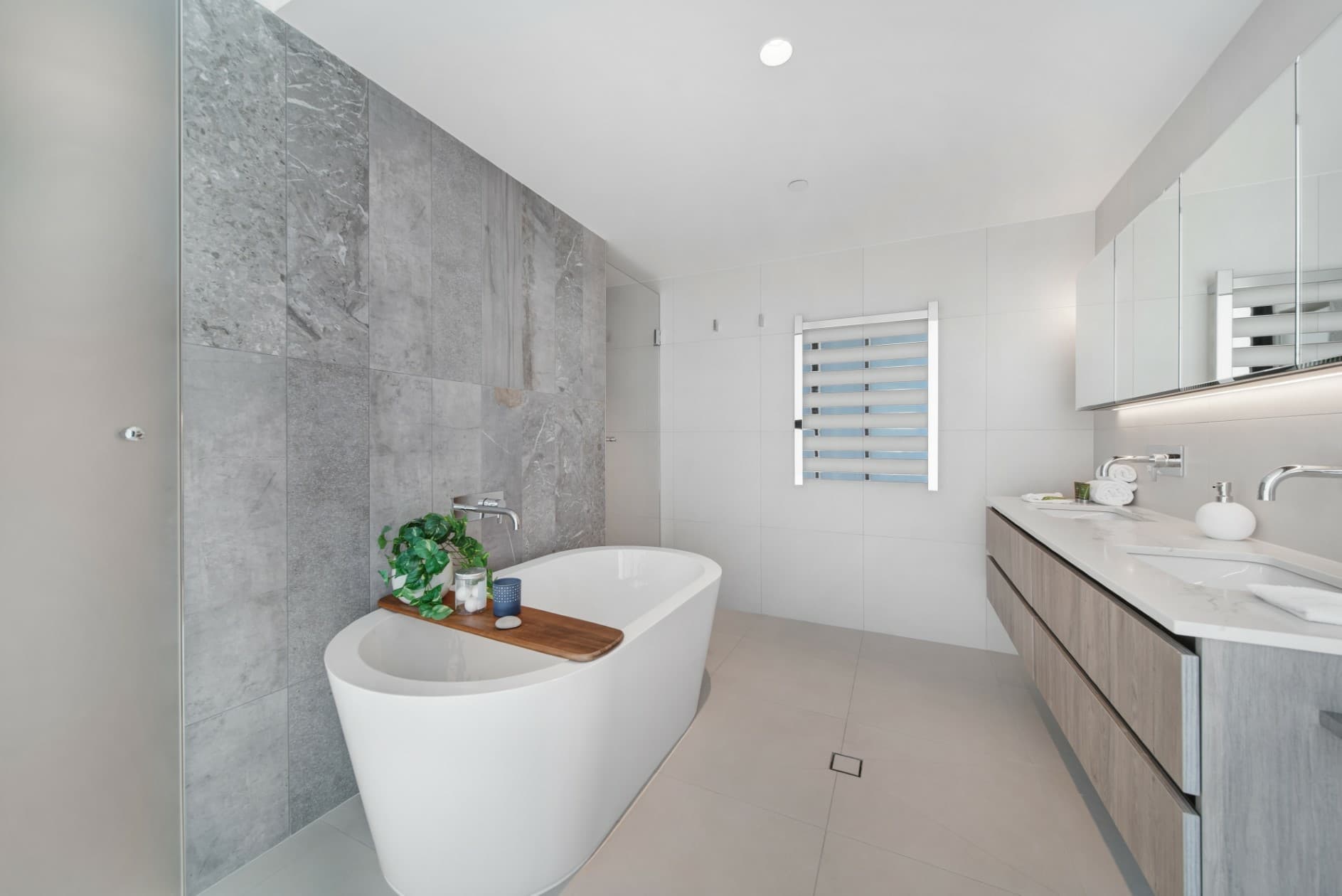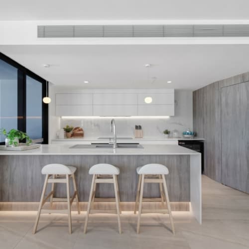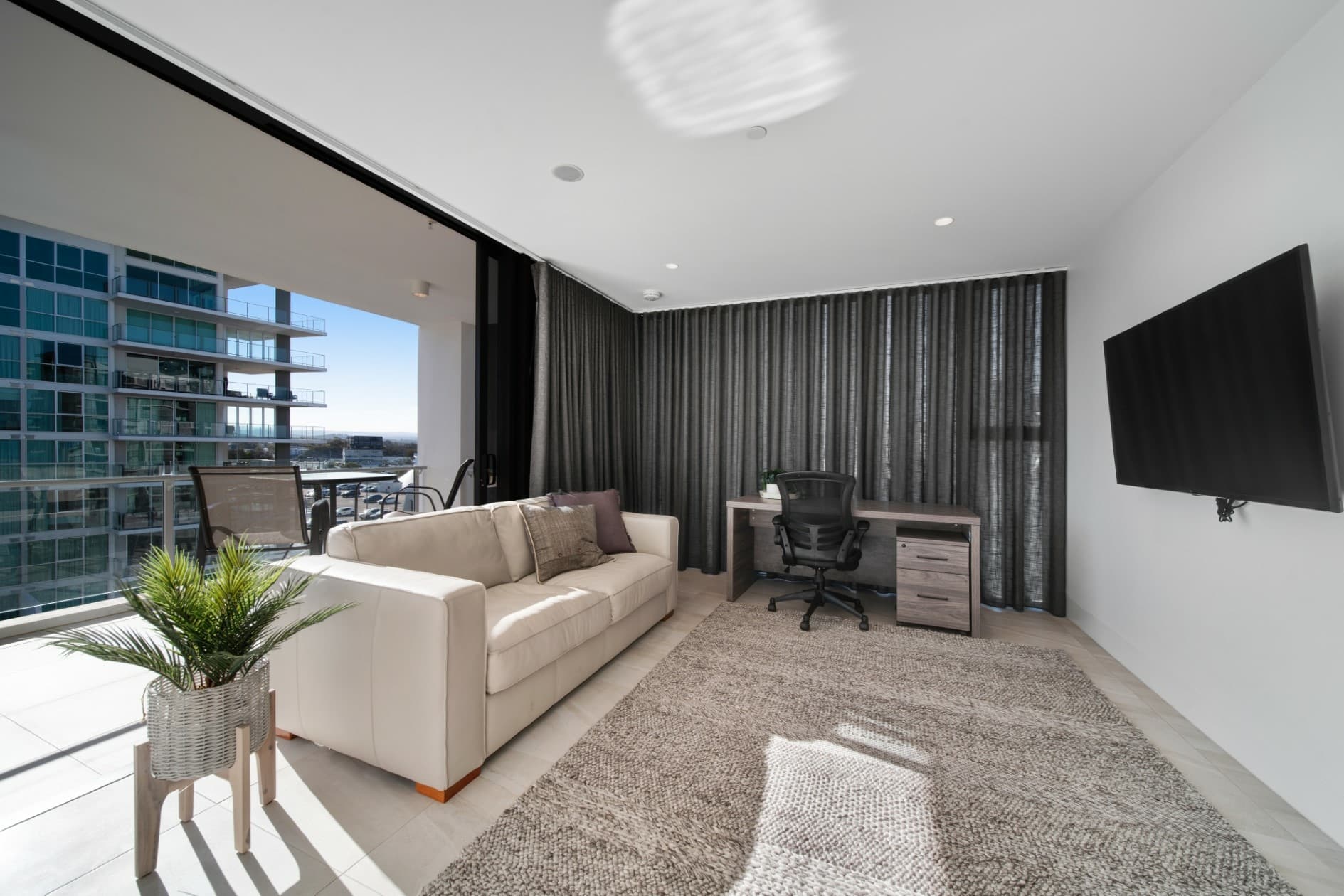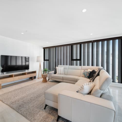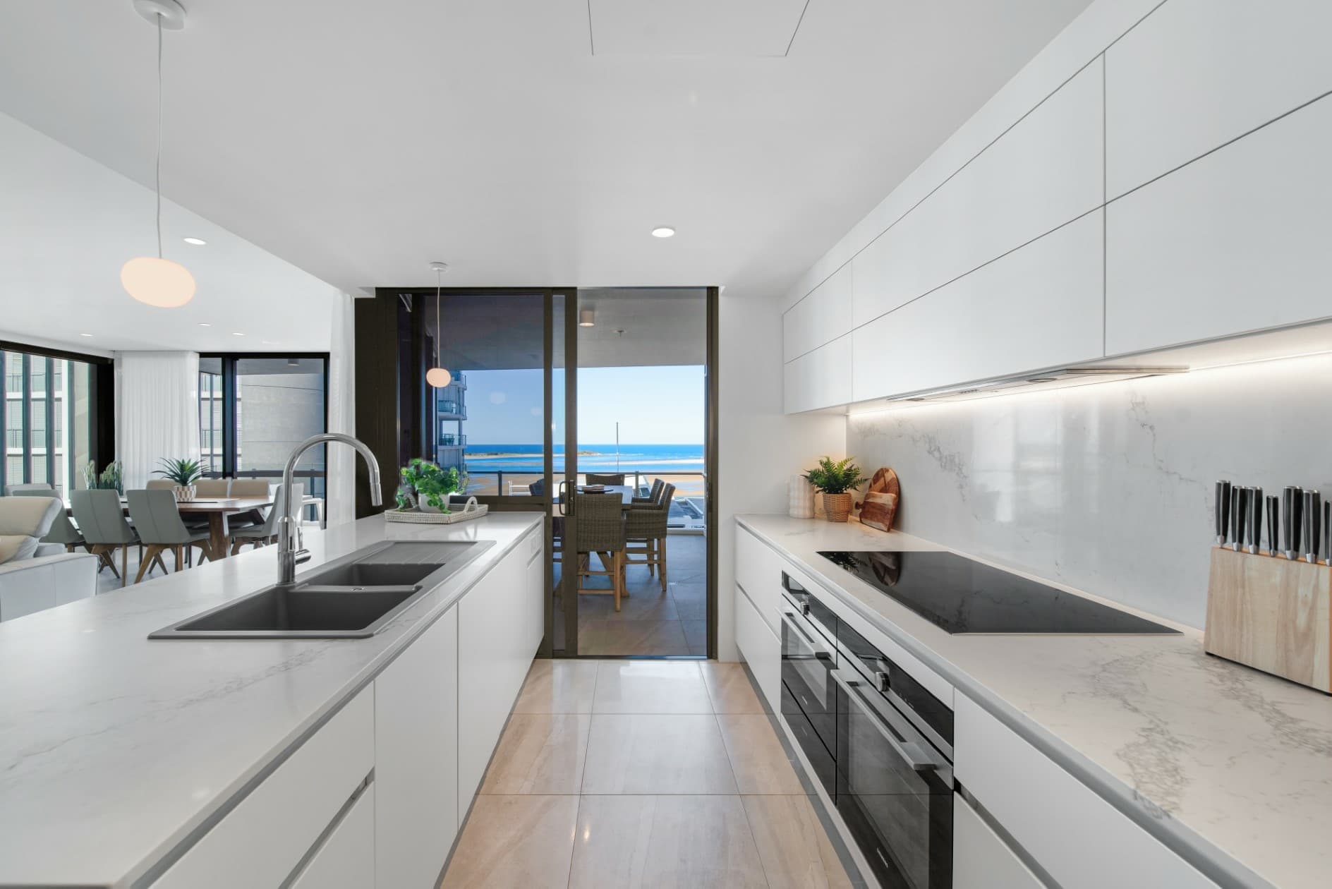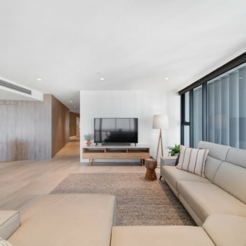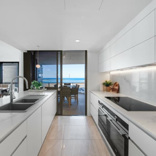 Alpha provides luxurious three-bedroom holiday apartments offering beautiful views over the Maroochy River and out to the ocean. Floor-to-ceiling windows flood the space with natural light, showcasing the sweeping water views from the living area.